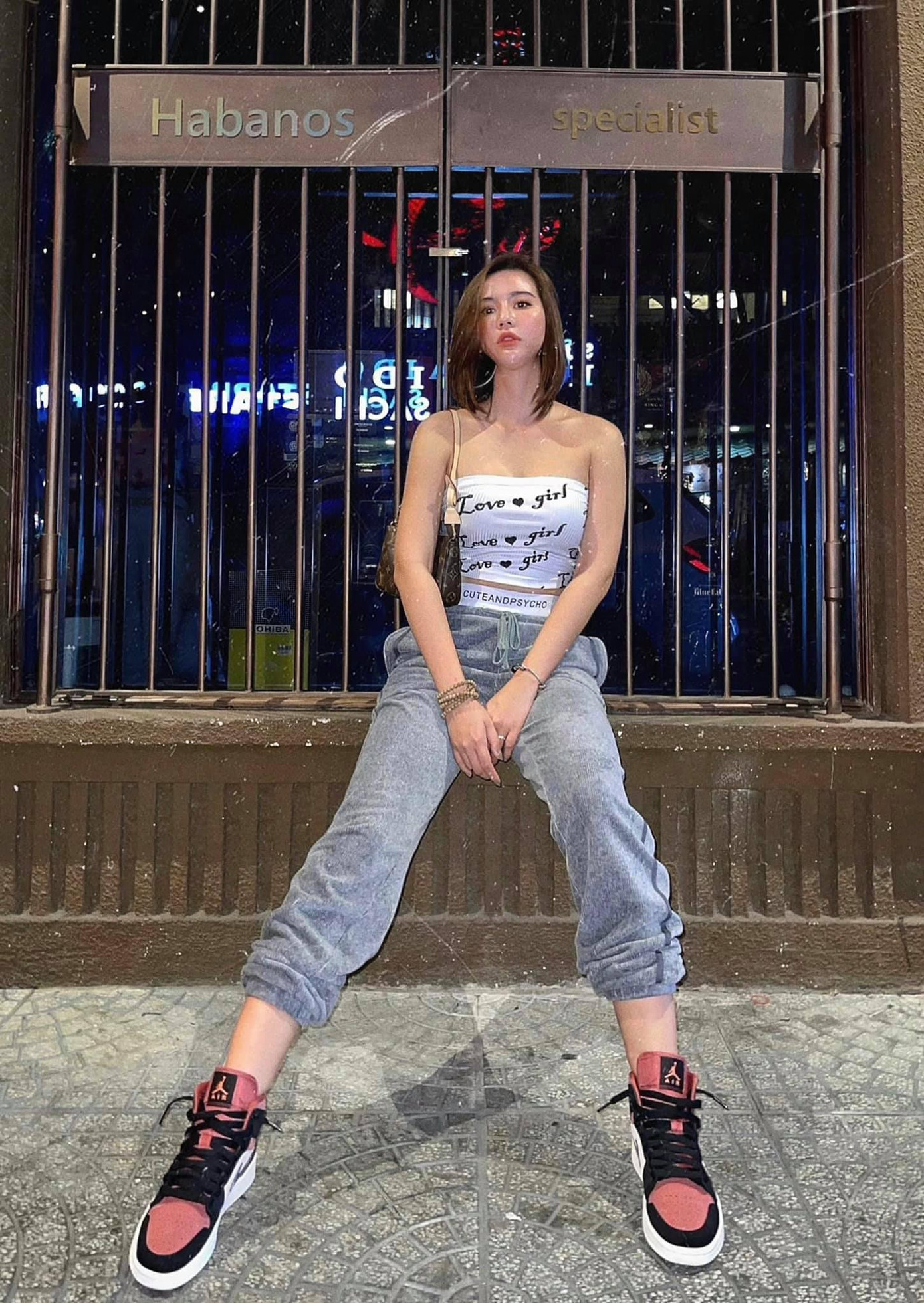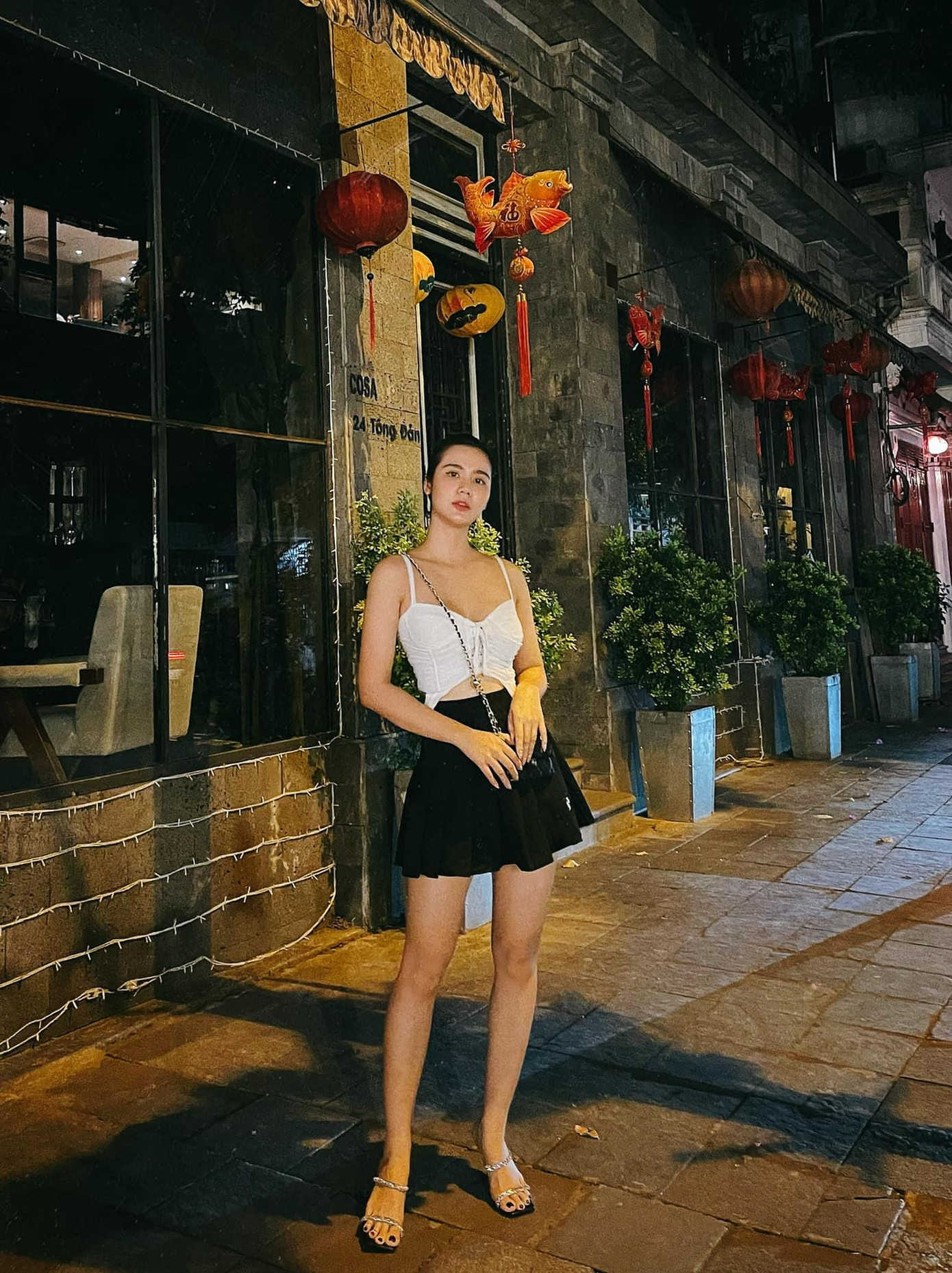 Nếu ngó sang style đời thường của Huyền Lizzie, nữ diễn viên cũng thường xuyên chọn quần hay váy cạp cao đi kèm áo crop-top. Công thức phối đồ này vừa giúp đôi chân trông dài hơn lại khoe được vòng eo thon thả.