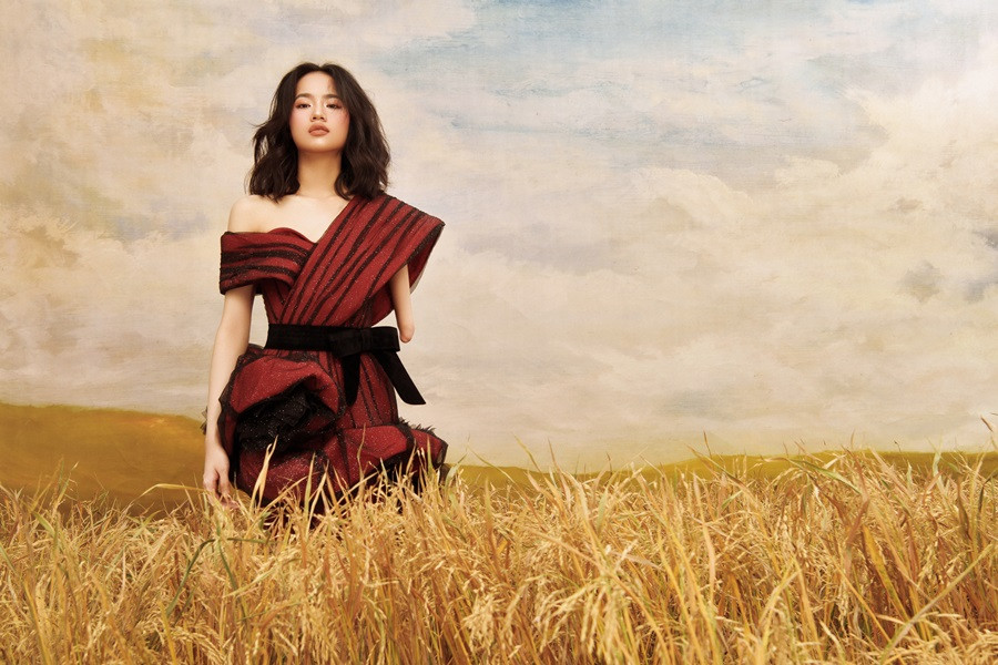 Gây sốt trên sàn diễn Vietnam Runway Fashion Week hồi cuối tháng 10, người mẫu khuyết tay Hà Phương tiếp tục được NTK Hà Duy ưu ái khi thực hiện bộ ảnh riêng. Giữa cánh đồng lúa vàng ươm được dựng lên trong studio, cô gái trẻ 15 tuổi như thiên thần với gương mặt đẹp tinh khiết cùng các thiết kế trong bộ sưu tập Darkness and Light.