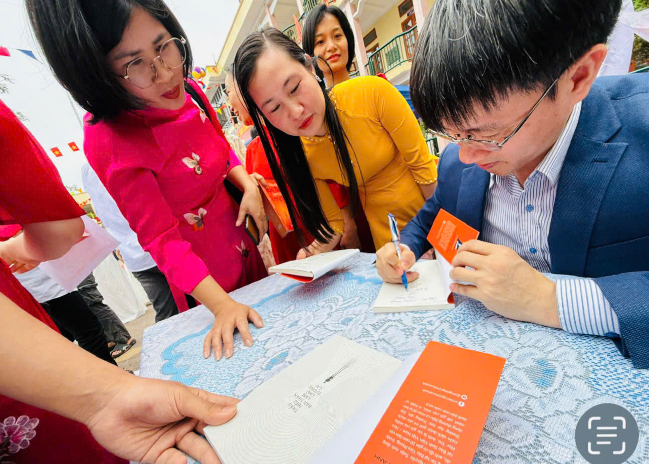 | Tác giả, nhà báo Nguyễn Tuấn Anh ký tặng sách các cô giáo Trường THPT Thanh Hà. |
