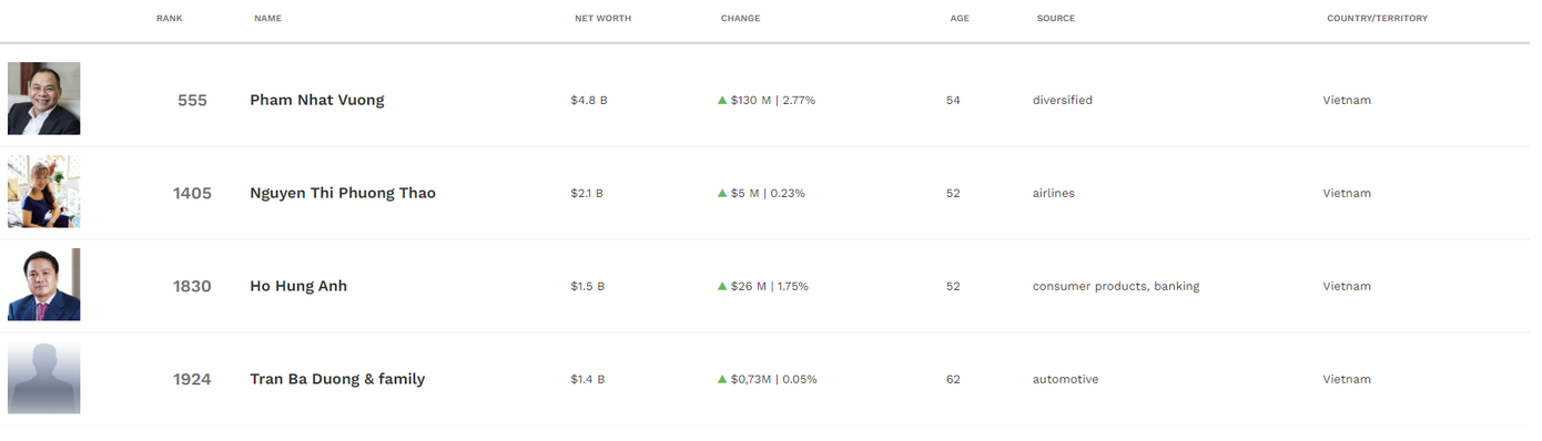 Cũng theo thống kê của Forbes, Việt Nam hiện có 6 doanh nhân lọt xếp hạng tỷ phú thế giới. Giá trị tài sản của 4 tỷ phú đều gia tăng trong sáng nay, cùng lúc thị trường chứng khoán khởi sắc. Dù cổ phiếu VJC giảm nhẹ, nhưng HDB lại tăng tới 3%, giúp tổng giá trị tài sản của nữ tỷ phú Nguyễn Thị Phương Thảo gia tăng 5 triệu USD trong sáng này. Tổng tài sản của CEO là 2,1 tỷ USD.