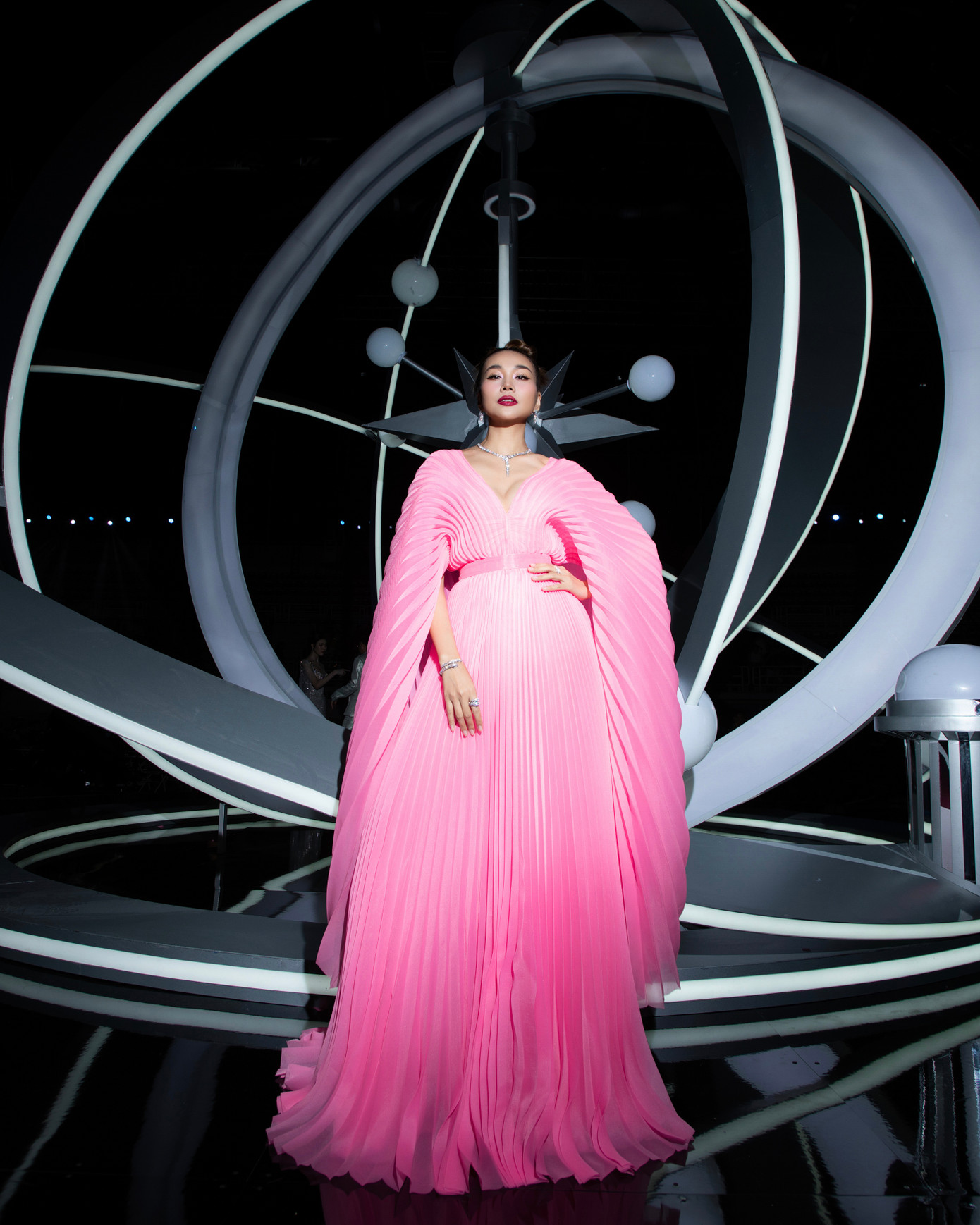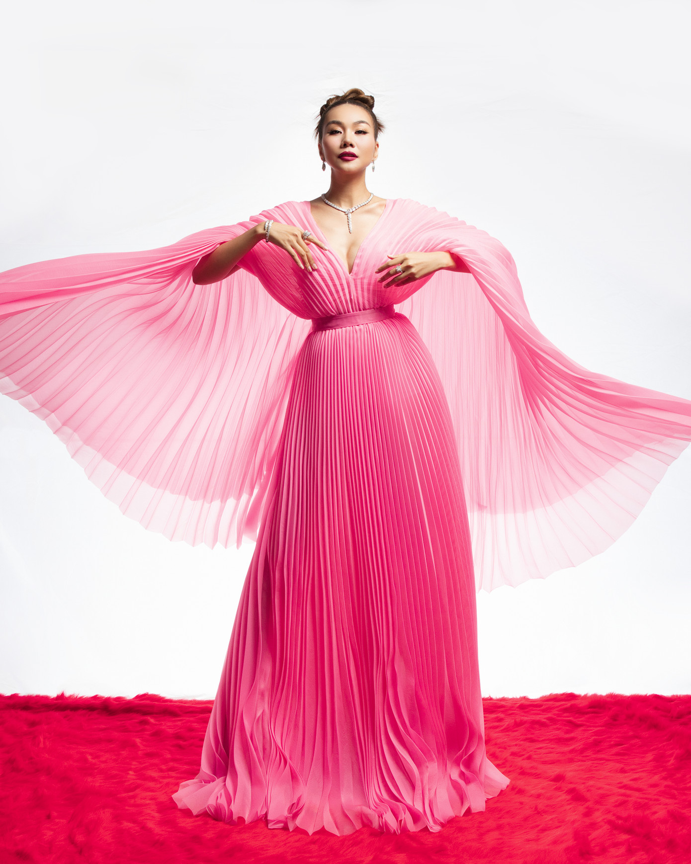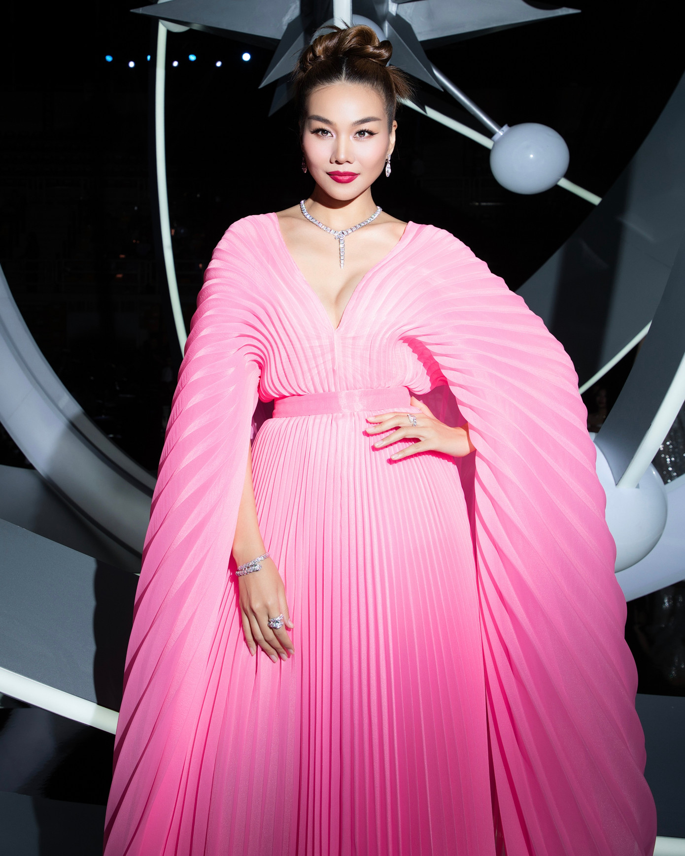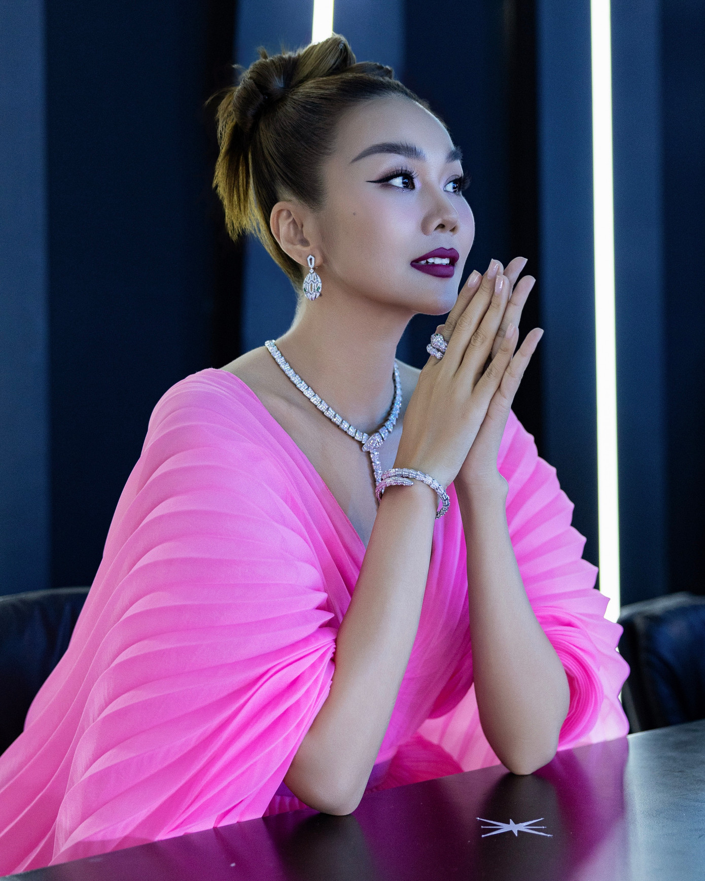 Thanh Hằng còn gây chú ý với bộ trang sức có tổng trị giá 9,5 tỷ đồng. Trong đó, chiếc vòng cổ đã có giá gần 4,3 tỷ đồng, chiếc lắc tay hơn 2 tỷ đồng, 2 chiếc nhẫn thì một chiếc hơn 1,5 tỷ đồng và một chiếc 660 triệu đồng, đôi hoa tai hơn 1 tỷ đồng.