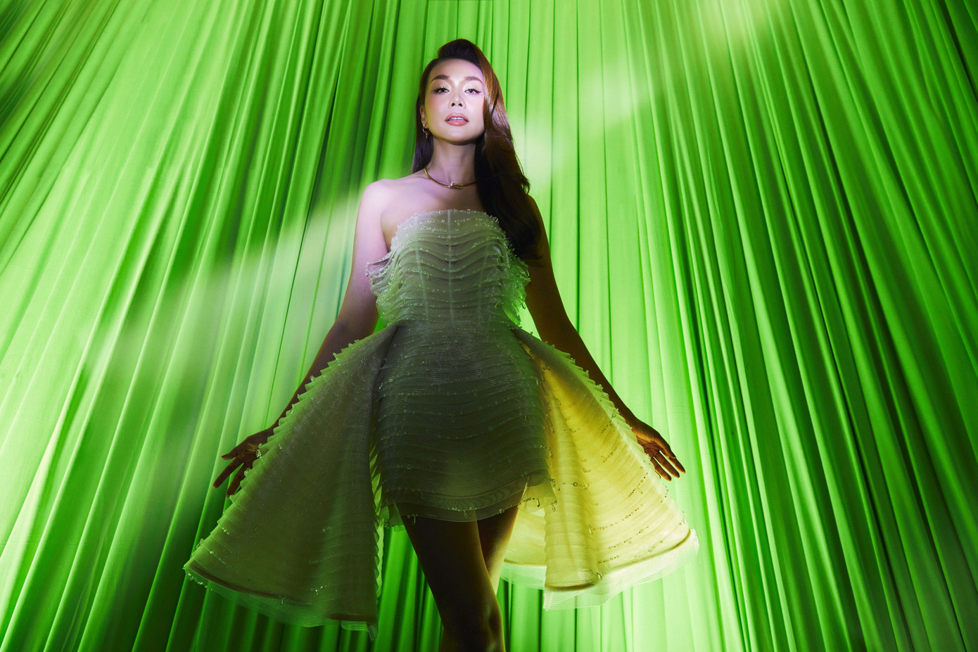 Đôi sandals cao gót tiệp màu váy, càng làm tăng nét thanh thoát, khiến đôi chân dài của Thanh Hằng như được kéo dài thêm. Tất cả được hoàn thiện bằng mái tóc uốn nhẹ, rẽ ngôi cổ điển kiểu Hollywood và lối trang điểm trong trẻo, vừa gợi nhắc phong cách kinh điển, vừa toát lên vẻ đẹp hiện đại.