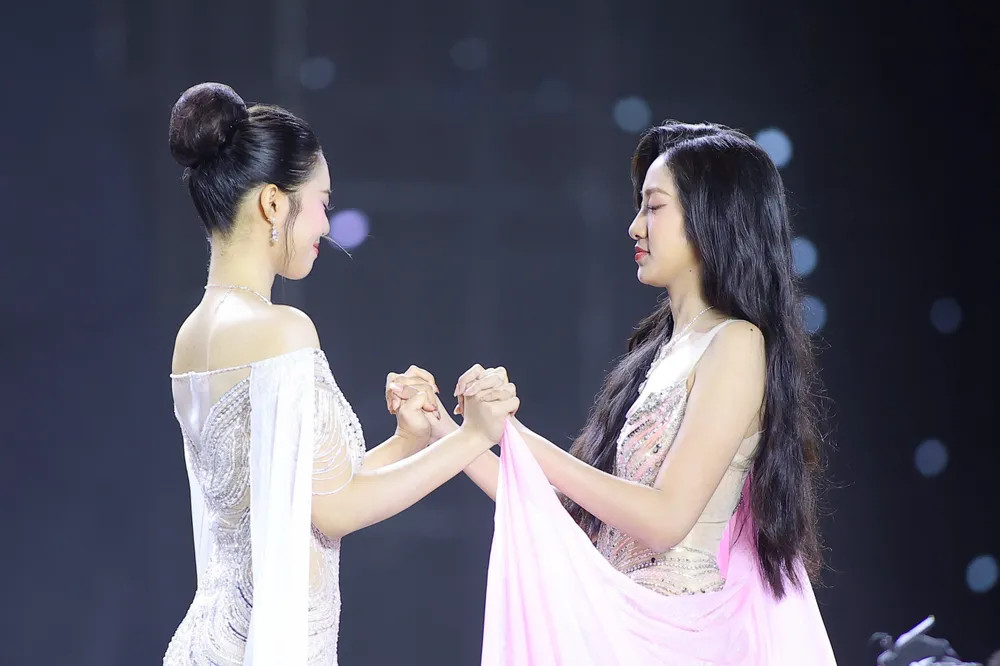 | Hà Trúc Linh nắm tay Á hậu 1 chờ xướng tên ngôi vị cao nhất (ảnh trên) và khoảnh khắc đội vương miện, cầm quyền trượng Hoa hậu Việt Nam 2024. |