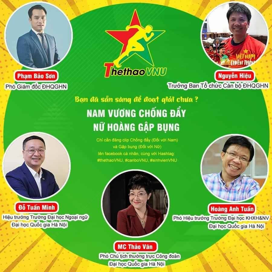 Tên đầy đủ của cuộc thi là “Nam vương chống đẩy- Nữ hoàng gập bụng” dành cho cán bộ, học sinh, sinh viên ĐHQG Hà Nội, diễn ra từ 6/4-5/6/2020. Cuộc thi gồm vòng loại, vòng bán kết và vòng chung kết.