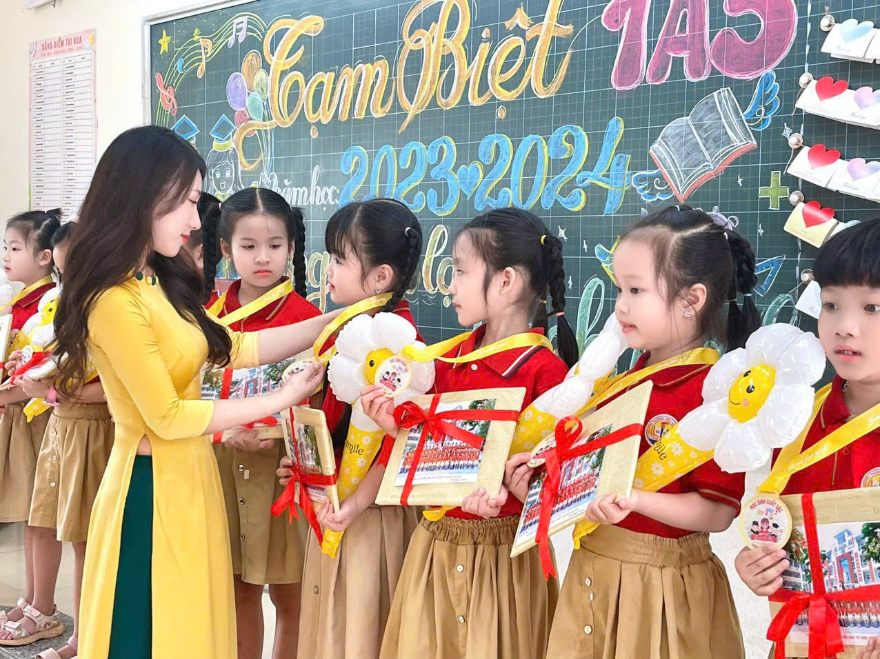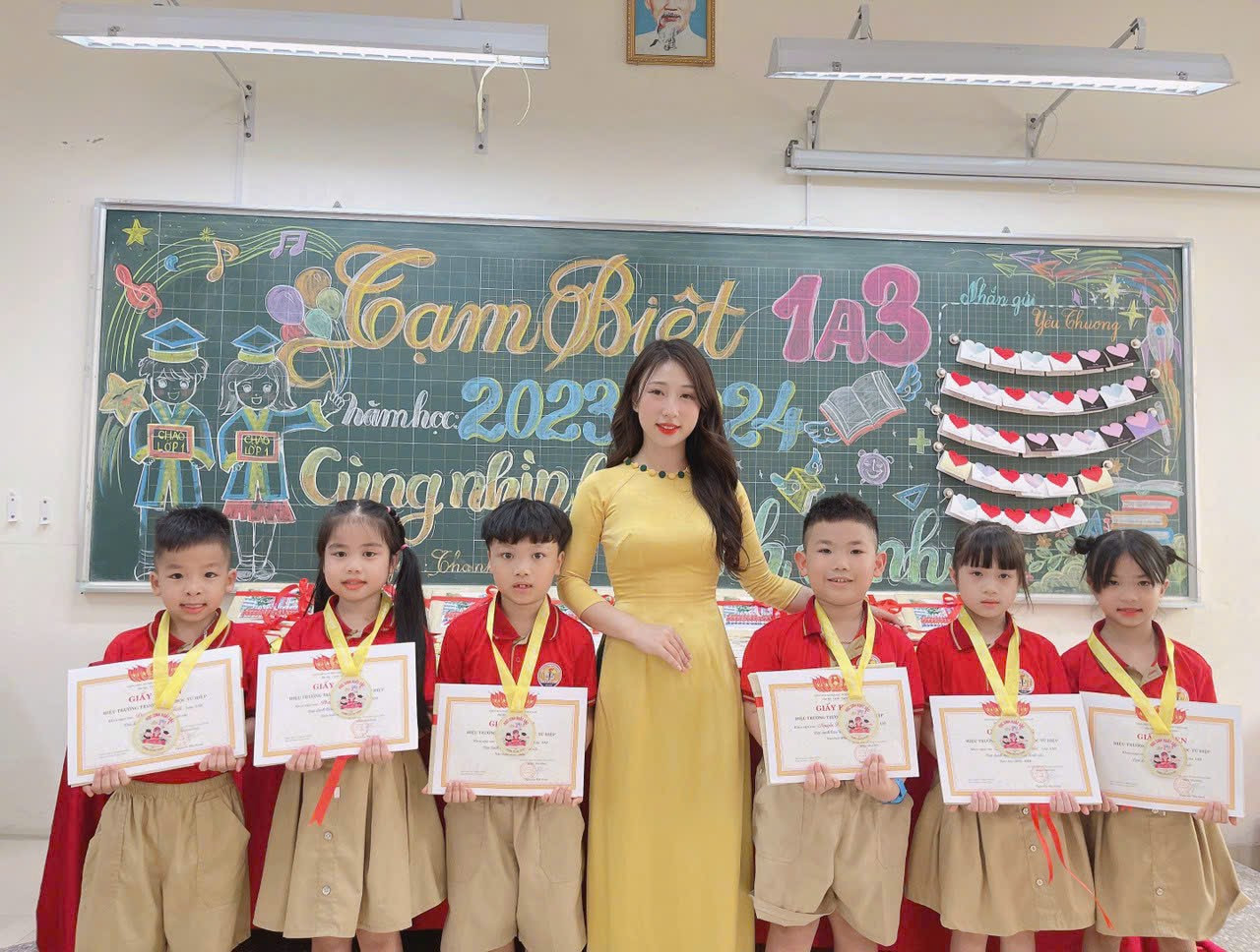 Gần đây, trong buổi lễ chia tay các em học sinh lớp 1, cô Hà đã gây “xôn xao” bởi hình ảnh lớp học được trang trí chu đáo, tỉ mỉ, với từng tấm thiệp, bảng huy hiệu cảm ơn được chu đáo dành tặng cho phụ huynh học sinh.