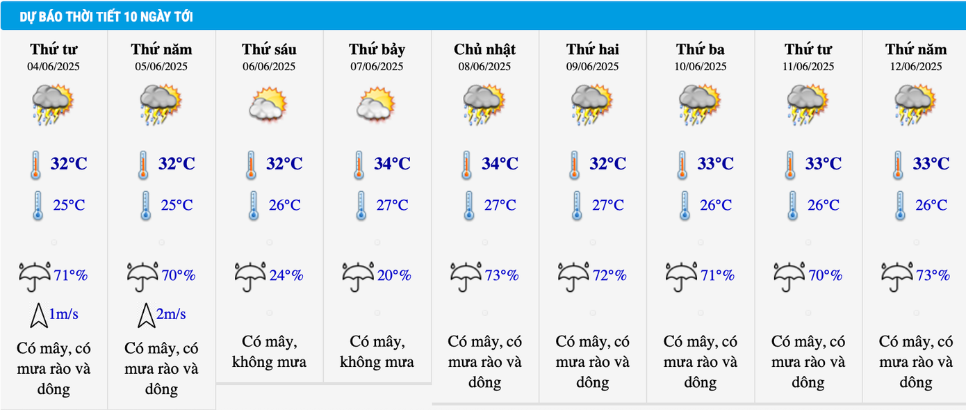 Theo biểu đồ thời tiết từ Trung tâm dự báo khí tượng thủy văn Trung ương, trong 2 ngày 7-8/6, dự báo tại khu vực Hà Nội xuất hiện nắng nóng, ban ngày có thể xuất hiện mưa rào vào buổi chiều, nhiệt độ cao nhất ban ngày lên tới 34 độ C, thấp nhất là 27 độ C, ban đêm và sáng sớm cũng có thể có mưa rào. Tuy nhiên, nhiệt độ cảm nhận thực tế có thể chênh 3-4 độ so với dự báo do hiệu ứng đô thị. Sang ngày 9/6, thời tiết sẽ hạ nhiệt đôi chút, nhiệt độ cao nhất khoảng 32 độ C, thấp nhất 27 độ C.