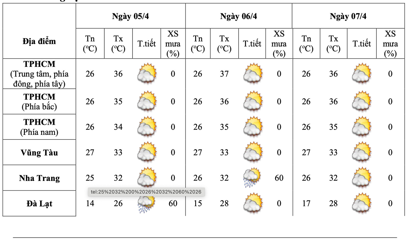 | Dự báo chi tiết thời tiết khu vực TPHCM và các điểm du lịch khu vực phía Nam. Nguồn: Đài Khí tượng Thủy văn khu vực Nam bộ |