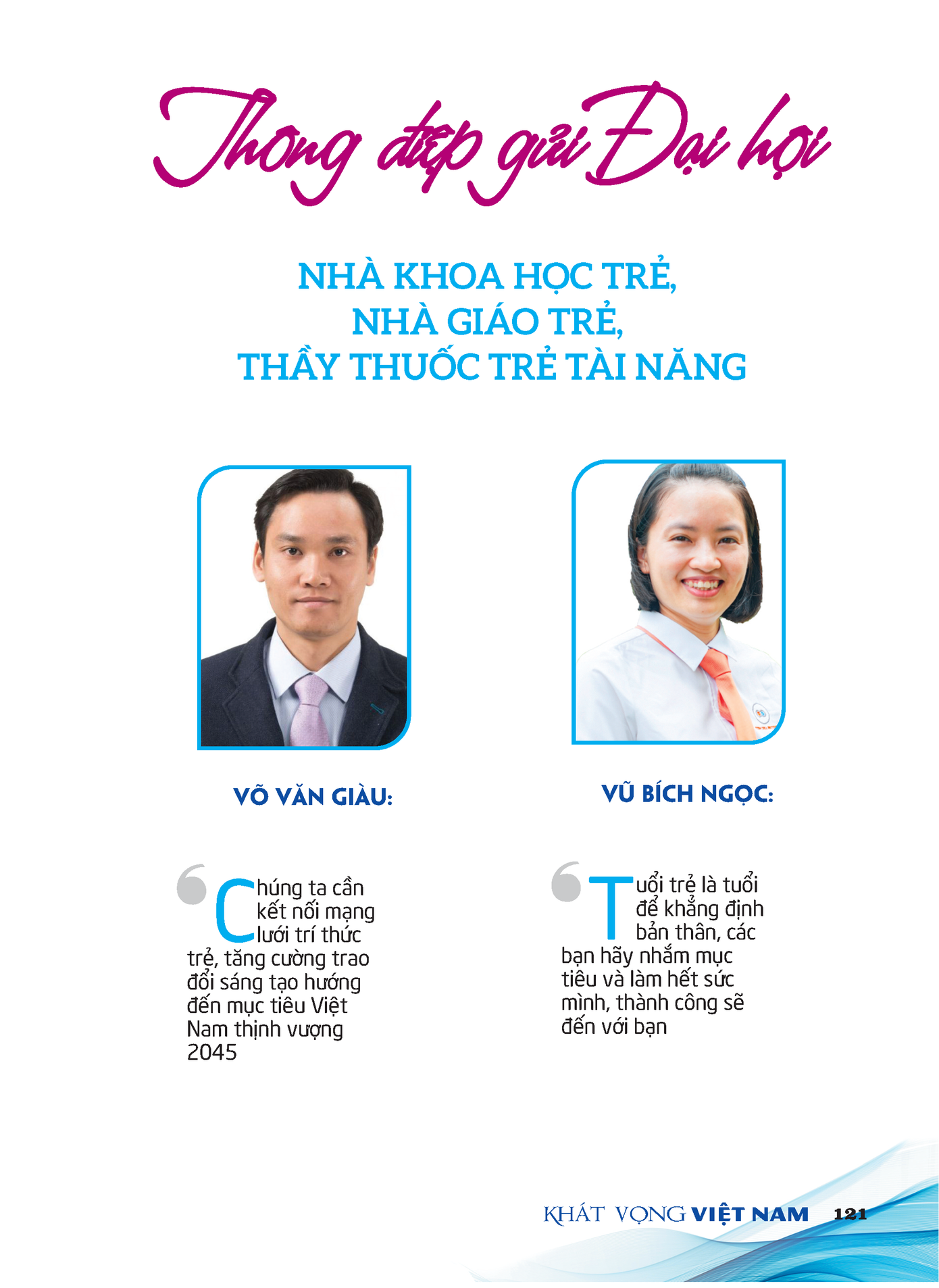 SVO - Đại hội Tài năng trẻ Việt Nam lần thứ III có chủ đề “Khát vọng Việt Nam”, được tổ chức tại Hà Nội từ ngày 11/12 đến 13/12/2020 với 400 đại biểu tham dự. Xin giới thiệu thông điệp của một số đại biểu muốn gửi tới Đại hội được trích từ kỷ yếu "Khát vọng Việt Nam".