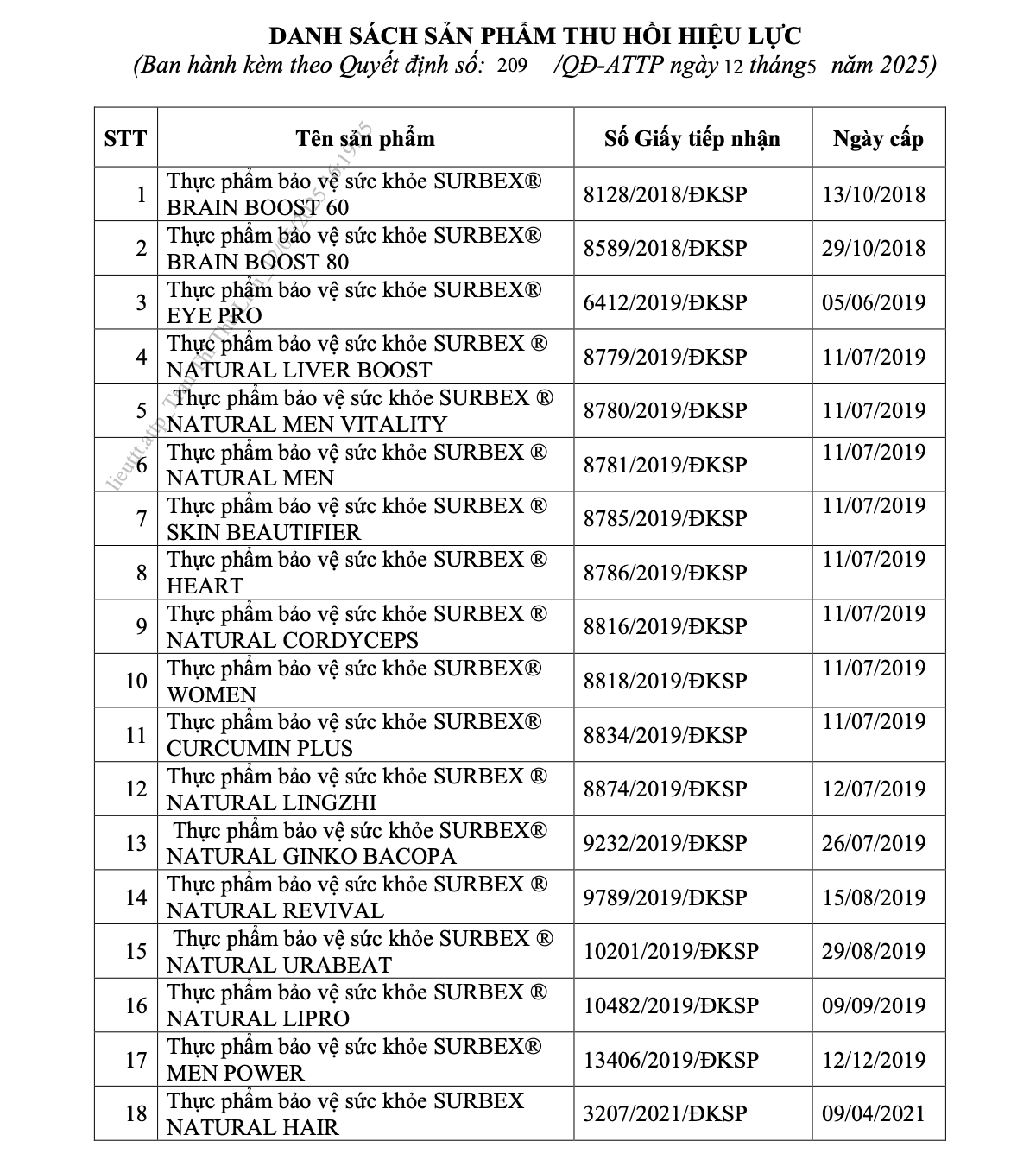 Danh sách 18 sản phẩm thực phẩm bảo vệ sức khỏe bị Cục An toàn thực phẩm thu hồi thu hồi hiệu lực giấy công bố gồm: Surex® Brain Boost 60; Surex® Brain Boost 80; Surex® Eye Pro; Surex® Natural Liver Boost; Brain Boost 60; Surex® Natural Men Vitality; Surex® Natural Men; Surex® Skin Beautifier; Surex® Heart; Surex® Natural Cordyceps; Surex® Women; Surex® Curcumin plus; Surex® Natural Lingzhi; Surex® Natural Ginko Bacopa; Surex® Natural Revival; Surex® Natural Urabeat; Surex® Natural Lipro; Surex® Men Power; Surex Natural Hair.