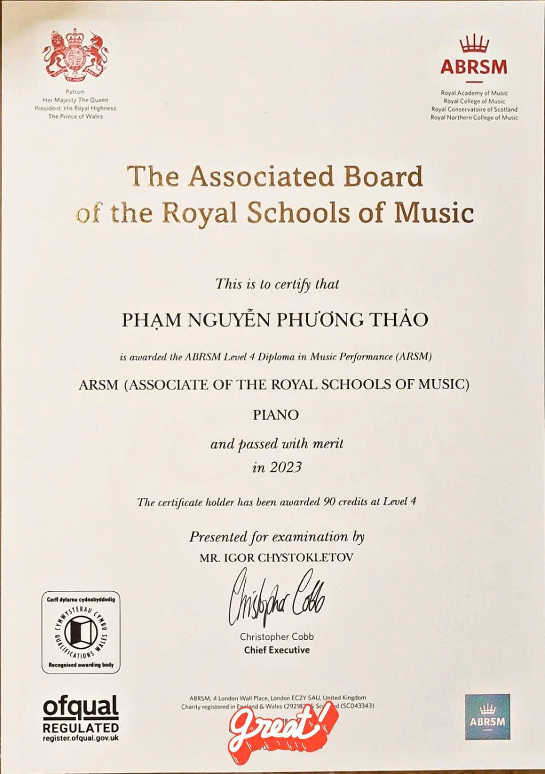 | Phương Thảo chinh phục Grade 8 chứng chỉ ABRSM loại Xuất sắc (Distinction). |