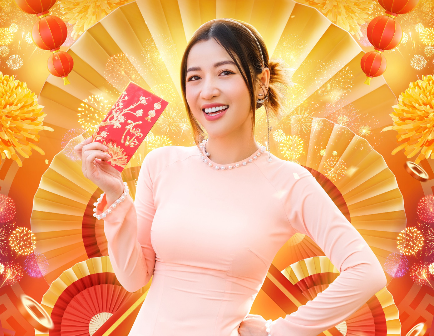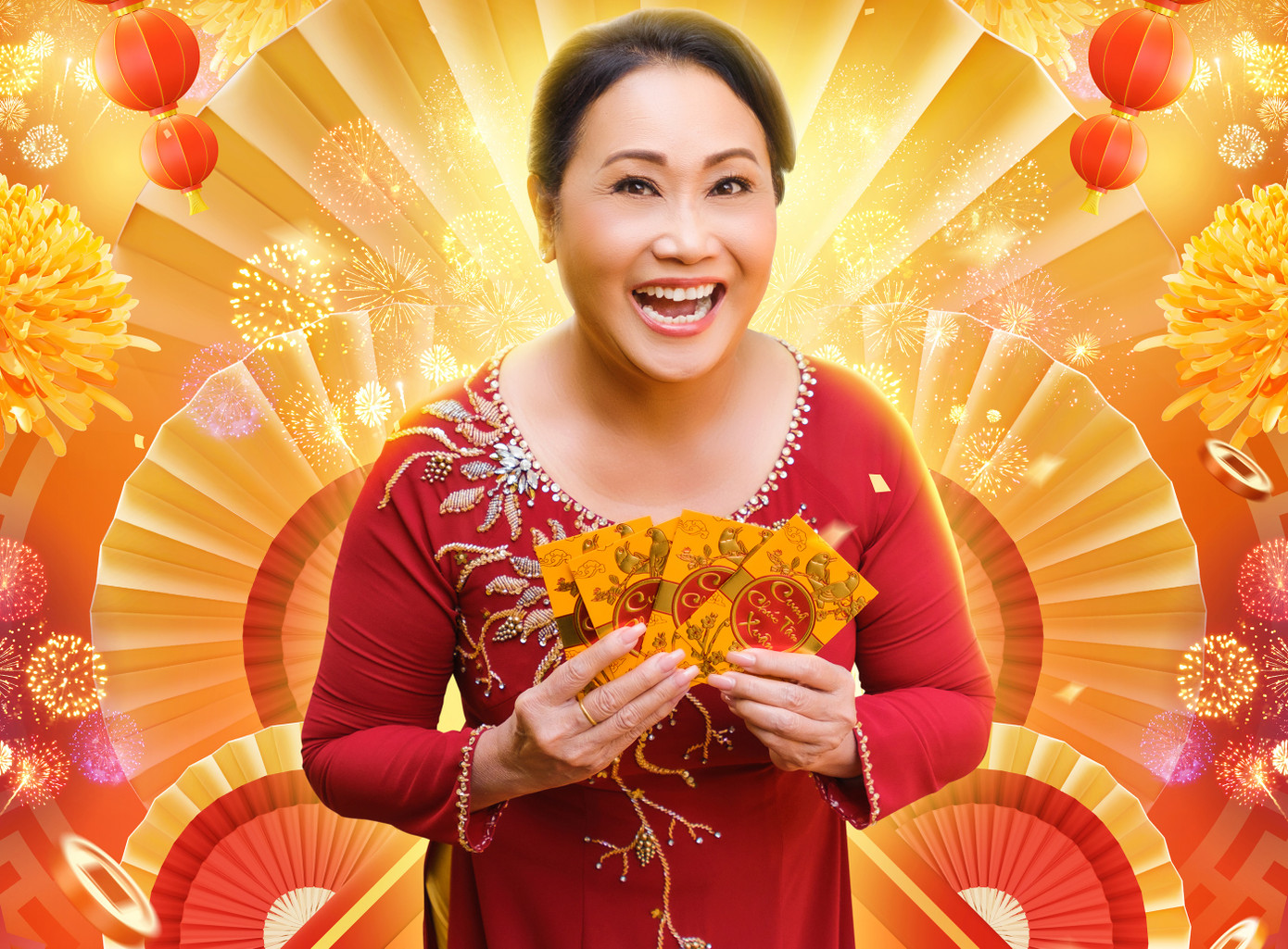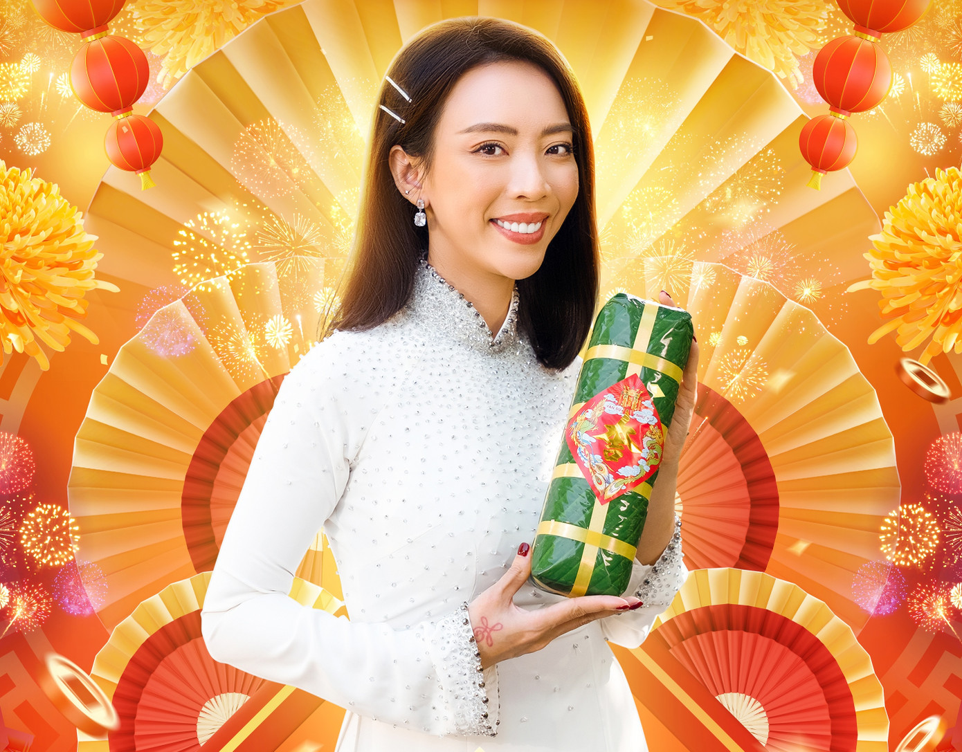 Hình ảnh quen thuộc của bánh chưng, bánh tét, câu đối đỏ, phong bao lì xì, dưa hấu lần lượt xuất hiện giữa các tông màu vàng, đỏ bắt mắt.