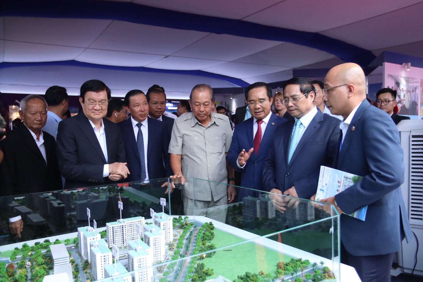 | Thủ tướng Phạm Minh Chính, Bí thư Tỉnh ủy Long An Nguyễn Văn Được và các đại biểu tham quan các gian hàng trưng bày, giới thiệu những sản phẩm đặc trưng và thế mạnh của Long An |