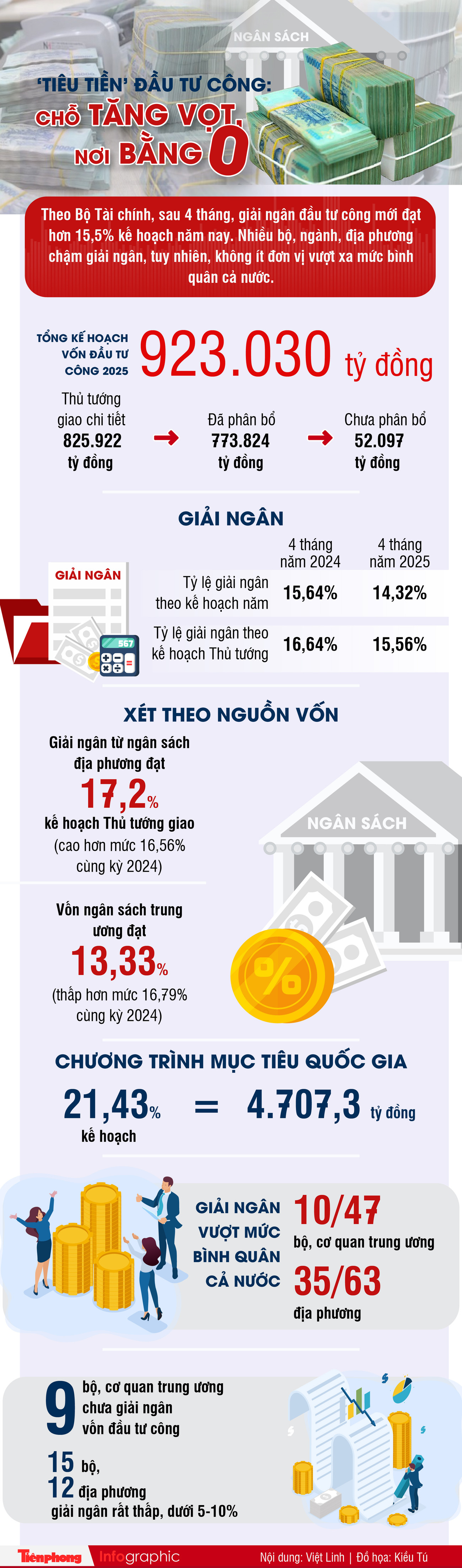 TPO - Theo Bộ Tài chính, 4 tháng qua, giải ngân đầu tư công mới đạt hơn 15,5% kế hoạch năm nay. Nhiều bộ, ngành, địa phương chậm giải ngân, nhưng cũng không ít đơn vị vượt xa mức bình quân cả nước.
