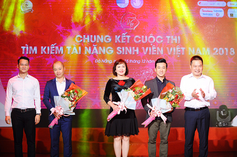 Đại diện BTC cuộc thi tặng hoa BGK tại Chung kết cuộc thi tìm kiếm Tài năng sinh viên Việt Nam 2018.