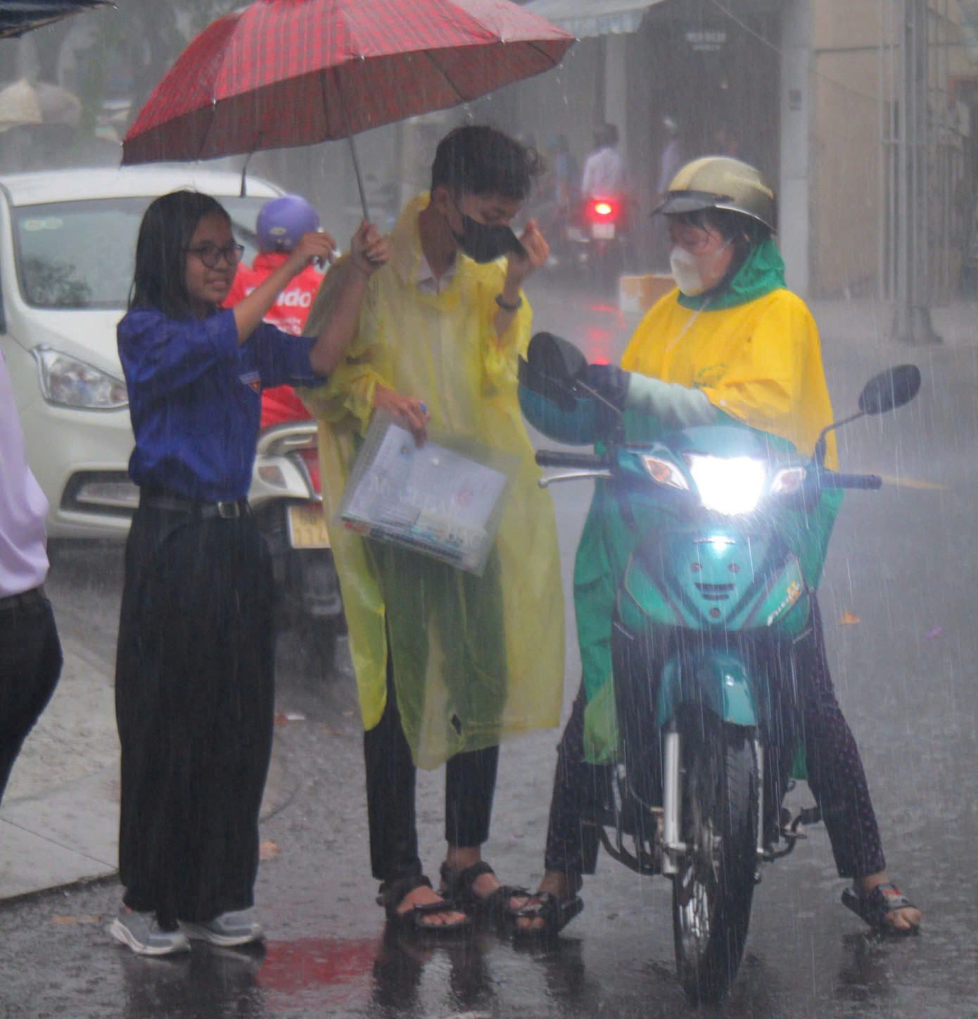 | Cơn mưa lớn vào buổi sáng, đặc biệt vào khung giờ các em hoàn thành bài thi môn Văn để về nhà, khiến việc đi lại của các em, đưa đón của phụ huynh gặp nhiều trở ngại. |