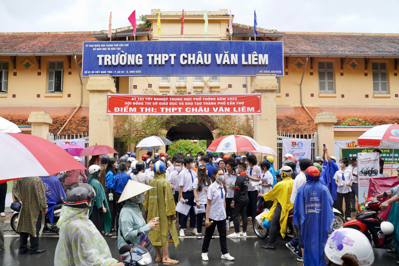 | Phụ huynh mặc áo mưa đón con tại điểm thi trường THPT Châu Văn Liêm, TP. Cần Thơ. |