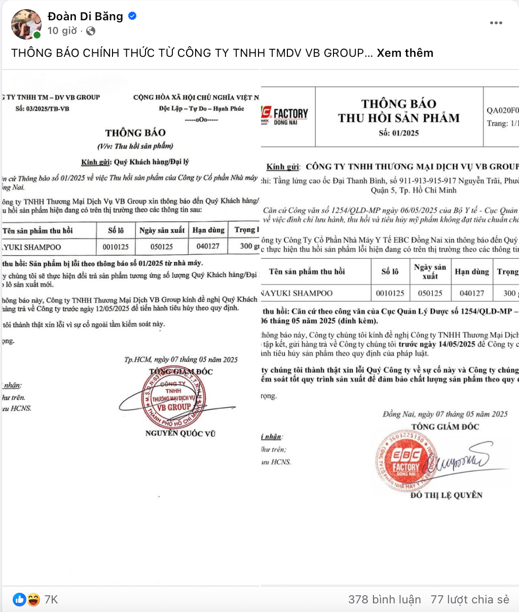 Khuya 7/5, Đoàn Di Băng đăng tải dòng thông báo ngay giữa đêm liên quan đến vụ việc. Cụ thể, cô chia sẻ thông báo chính thức từ công ty VB Group về lô dầu gội Hanayuki bị buộc thu hồi.