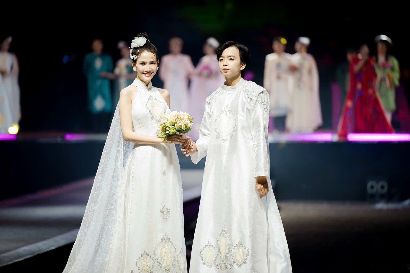 Là một trong những nghệ sĩ góp mặt tại sự kiện, Phan Thị Mơ đảm nhận vai trò vedette trong bộ sưu tập “Dấu xưa - Ký ức tình yêu”. Diện áo dài trắng đính hoa cùng chi tiết cổ yếm cách điệu, cô gây ấn tượng với phong thái tự tin.