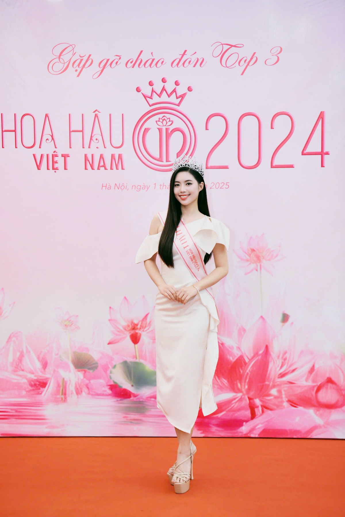 Tại buổi Gặp gỡ chào đón ở trụ sở Hoàng Thanh Media, đơn vị đồng tổ chức cuộc thi Hoa hậu Việt Nam, Top 3 Hoa hậu Việt Nam diện váy dài gam màu sáng, thanh lịch và dịu dàng.