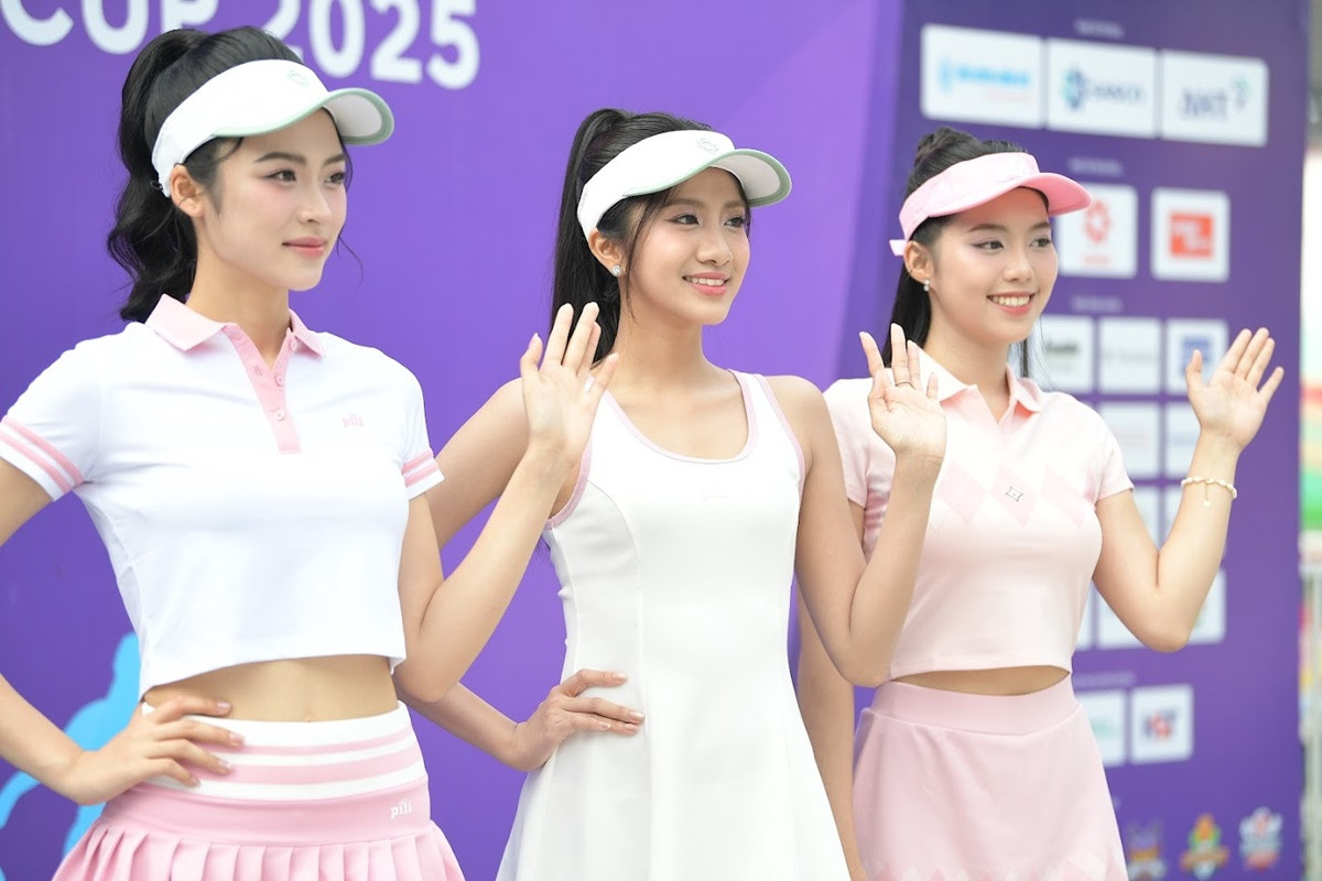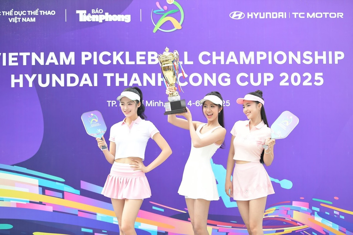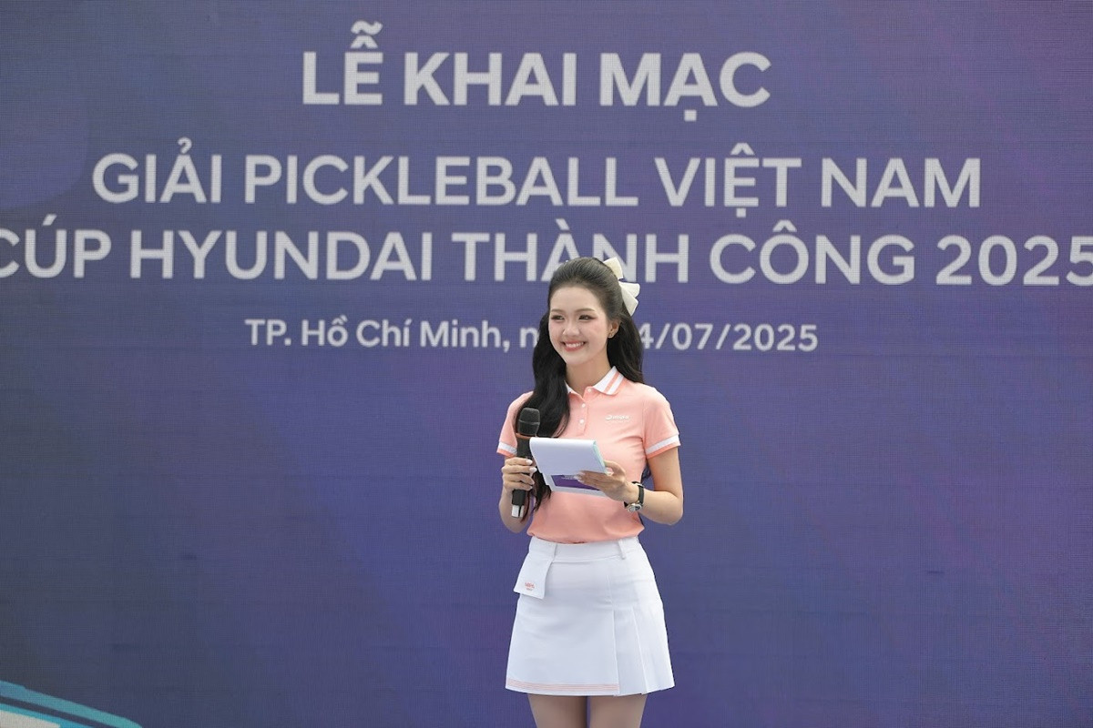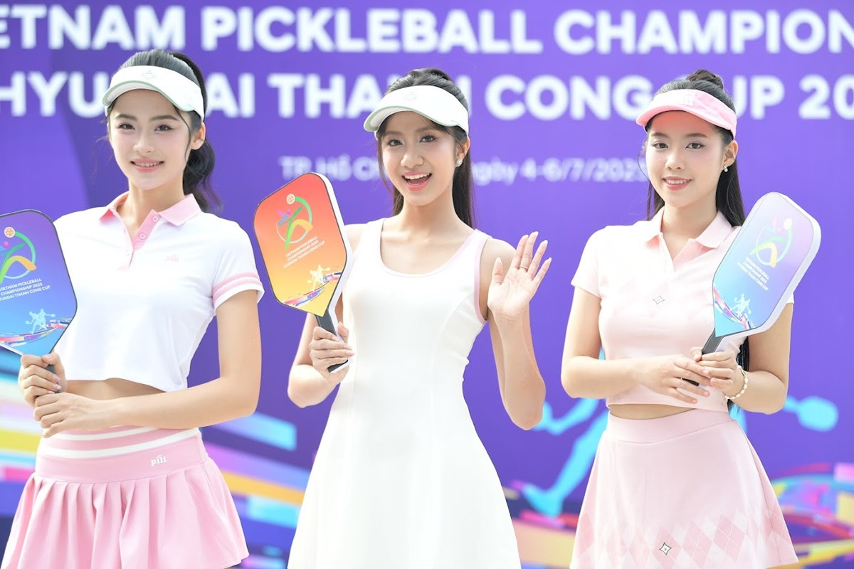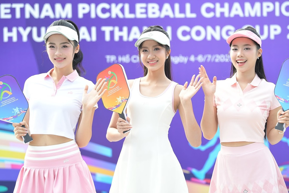 Hoa hậu Hà Trúc Linh cùng Á hậu Châu Anh, Á hậu Vân Nhi tham dự Lễ khai mạc Giải Pickleball Việt Nam - Cúp Hyundai Thành Công 2025 diễn ra sáng 4/7 do Báo Tiền Phong tổ chức.