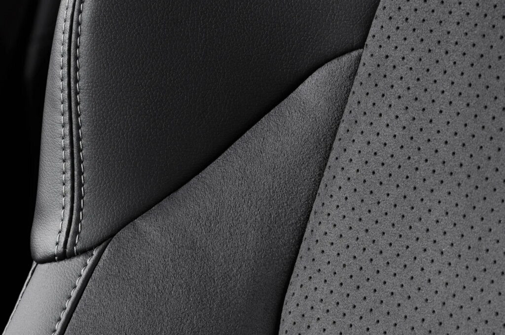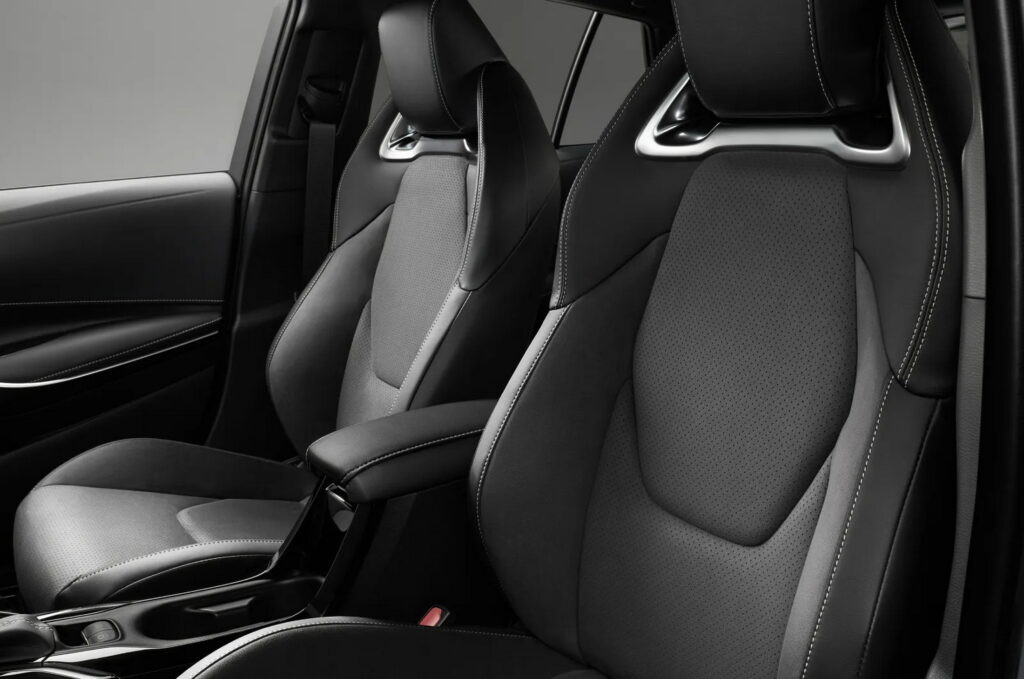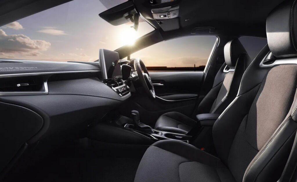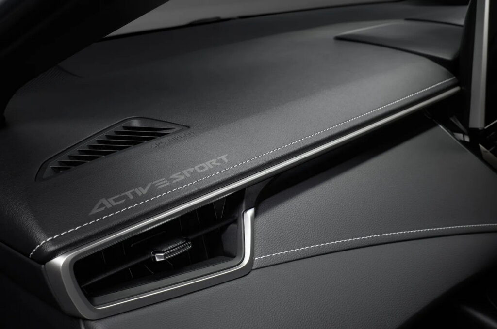 Bên trong cabin, Toyota Corolla Active Sport 2024 được bổ sung ghế trước thể thao, tích hợp tựa đầu và đệm đỡ. Bộ ghế này được bọc da tổng hợp và da lộn Blancnove, đi kèm các đường chỉ khâu màu xám và các chi tiết trang trí bằng nhôm tương phản với nội thất tông đen. Ngoài ra, xe còn có bàn đạp nhôm cùng tùy chọn logo Active Sport trên thảm sàn.