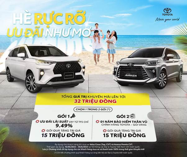 Khách mua Veloz Cross (Top & CVT) và Avanza Premio CVT trong thời gian diễn ra chương trình, sẽ nhận được gói khuyến mãi giá trị cao nhất lên tới 32 triệu đồng bao gồm gói quà tặng trị giá 15 triệu, 01 năm bảo hiểm thân vỏ Toyota (gói Vàng) hoặc gói hỗ trợ tài chính với lãi suất ưu đãi 8.99% trong 12 tháng đầu.