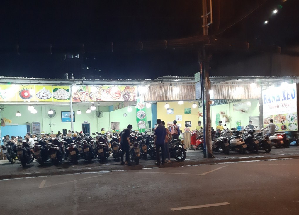 Những quán bánh xèo trên đường Ung Văn Khiêm vào buổi tối có rất đông các bạn sinh viên ghé ăn. Huy Thanh (trường ĐH Giao thông Vận tải TP. HCM) chia sẻ: "Những ngày dịch cao điểm, đa phần tụi mình tự nấu ăn là chính. Ra ngoài ăn cũng rất ít lựa chọn. Chủ yếu là chỉ mua cơm hộp mang về. Nay thành phố cho “nới lỏng” nên mình kiếm mấy loại bánh ăn đổi món cho đỡ chán. Nhưng thấy quán đông quá nên mình mua mang về”.