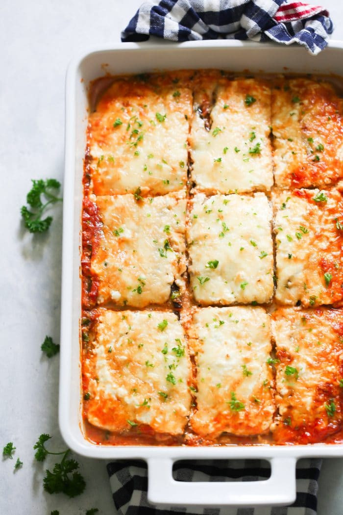 Để ngon hơn, Lasagna được phủ sốt béchamel rồi bỏ vào lò nướng. Sau khi ra lò, mỳ có màu vàng, đỏ đẹp mắt cộng với phần phô mai tan chảy khiến cho món ăn hấp dẫn từ cái nhìn đầu tiên.