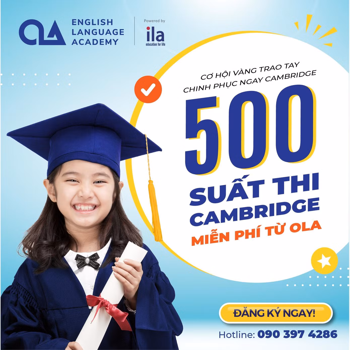 Thừa hưởng hơn 20 năm kinh nghiệm của ILA (Tổ chức giáo dục Anh ngữ hàng đầu Việt Nam), cùng sứ mệnh đào tạo 1.000.000 học viên VIệt Nam xuất sắc Anh ngữ, với chương trình trao tặng 500 suất thi chứng chỉ Cambridge ESOL miễn phí, OLA mong muốn tạo thêm động lực để các em lên kế hoạch chinh phục các chứng chỉ quốc tế từ sớm, xuất sắc tiếng Anh và tự tin chạm đến mọi ước mơ trong tương lai.