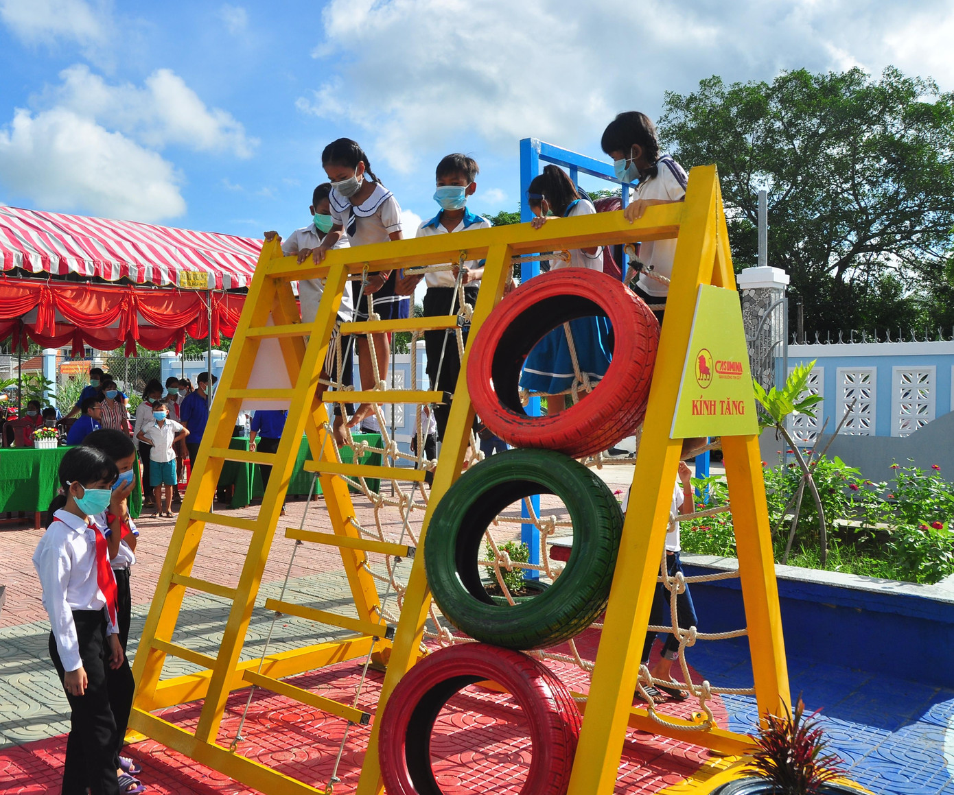 | Theo đó, Đoàn công tác của Trung ương Đoàn do anh Nguyễn Ngọc Lương, Bí thư Trung ương Đoàn, Chủ tịch Hội Đồng Đội Trung ương làm trưởng đoàn đến khánh thành, trao tặng công trình sân chơi cho thiếu nhi trị giá 220 triệu tại trường Mẫu giáo Phong Thạnh, ấp Cây Gòn, xã Phong Thạnh. Công trình do Cty CP Công nghiệp cao su miền Nam (Casumina) tài trợ. - Ảnh: Hòa Hội |