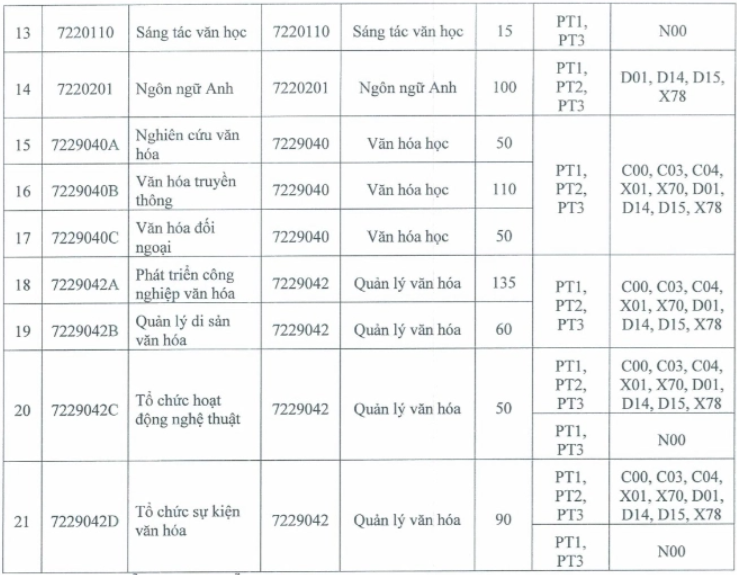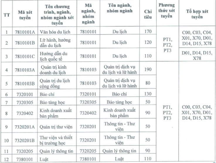 Năm 2025, Trường đại học Văn hóa Hà Nội dự kiến tuyển tổng chỉ tiêu là 1.900, theo 3 phương thức gồm xét tuyển thẳng và ưu tiên xét tuyển, xét dựa vào điểm thi tốt nghiệp THPT, xét dựa vào học bạ THPT.
