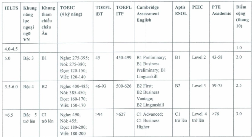 Theo thông tin mới nhất, thí sinh có IELTS từ 4.0 - 4.5 sẽ được cộng 1 điểm, IELTS 5.0 được cộng 2 điểm, IELTS 5.5 - 6.0 sẽ được cộng 2.5 điểm, IELTS từ 6.5 trở lên cộng 3 điểm.