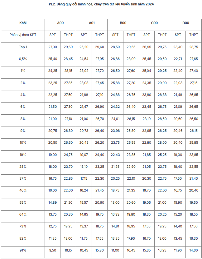 Bảng quy đổi minh họa, chạy trên dữ liệu tuyển sinh năm 2024: