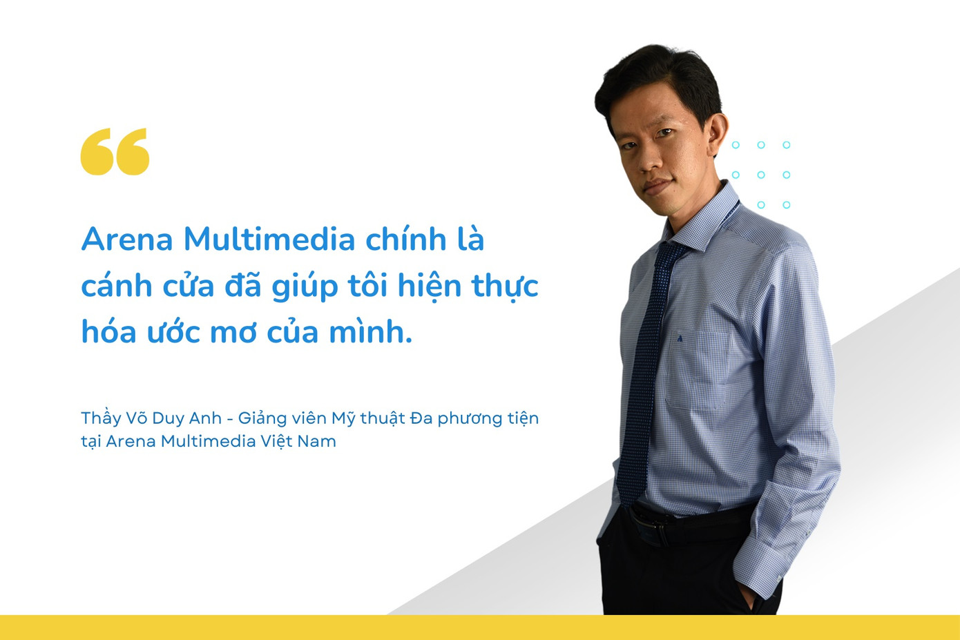 Bởi vì Arena Multimedia không dạy theo kiểu “đẩy kiến thức”, mà dạy từ gốc rễ - bài bản - và thực tiễn. Từ tư duy thẩm mỹ, kỹ năng làm việc nhóm, kỹ thuật phần mềm đến xây dựng ý tưởng sáng tạo, tất cả đều được đào tạo có hệ thống. Và trên hết, các bạn luôn được đồng hành và hỗ trợ bởi những người thầy như thầy Duy Anh - người tin rằng sự tận tâm có thể biến bất kỳ ai trở thành một người làm sáng tạo thực thụ.