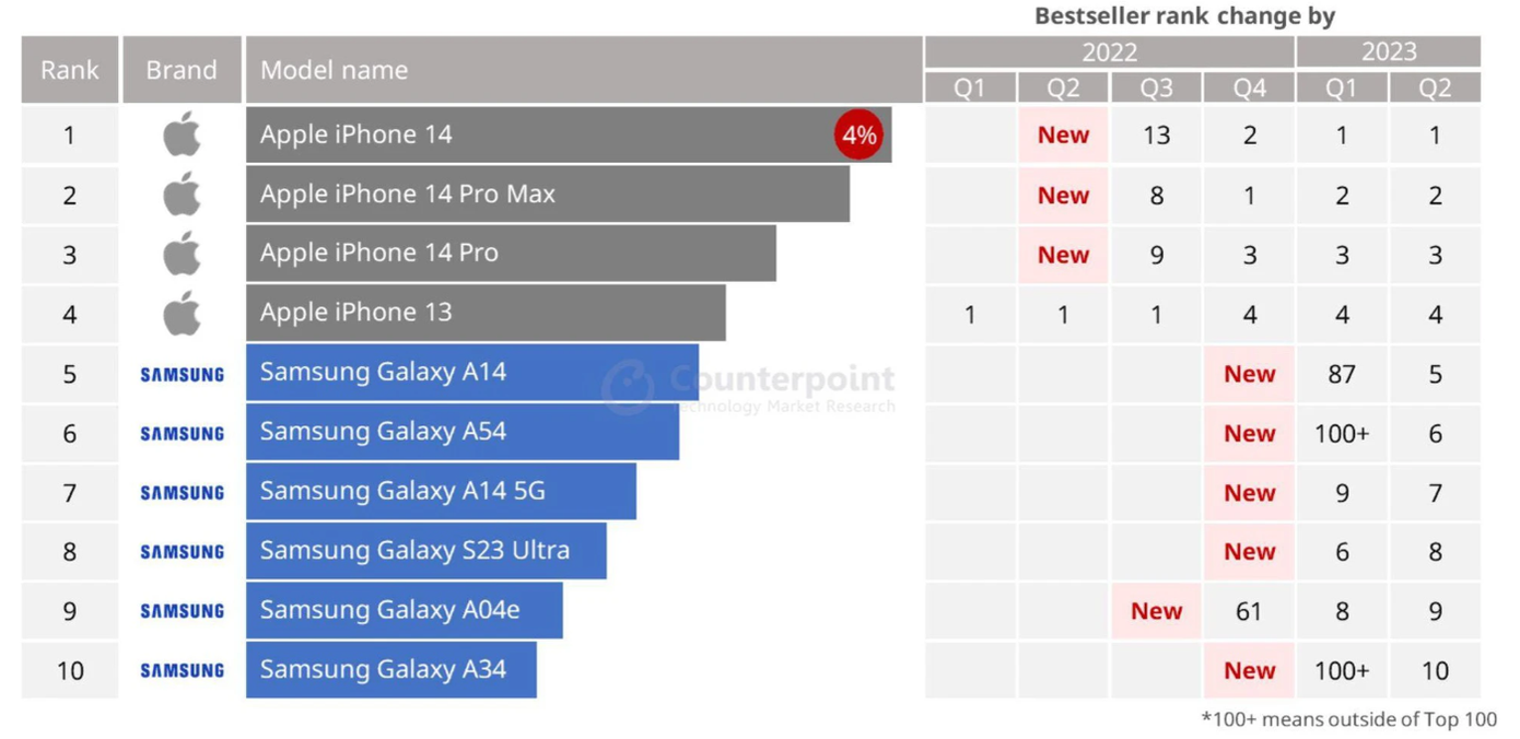 Điều này được minh chứng dựa vào thống kê của Counterpoint đến Q2/2023, Samsung chiếm 6 trong số 10 smartphone bán chạy nhất và hết 5 trong số đó là dòng Galaxy A.