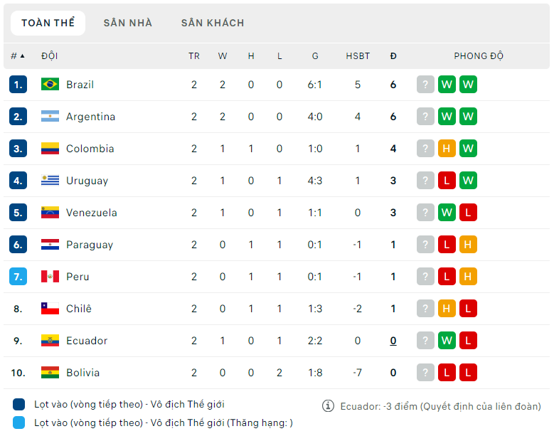 Bảng xếp hạng vòng loại World Cup 2026 khu vực Nam Mỹ 2026