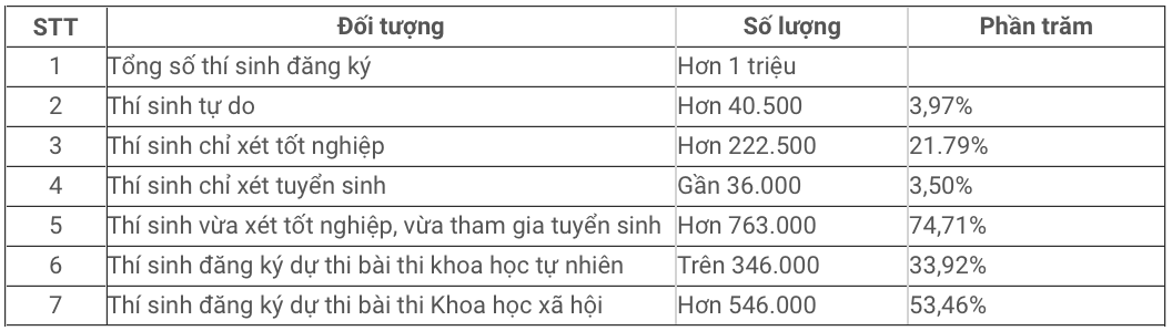 Chi tiết tình hình đăng ký dự thi tốt nghiệp THPT của thí sinh năm nay như sau: