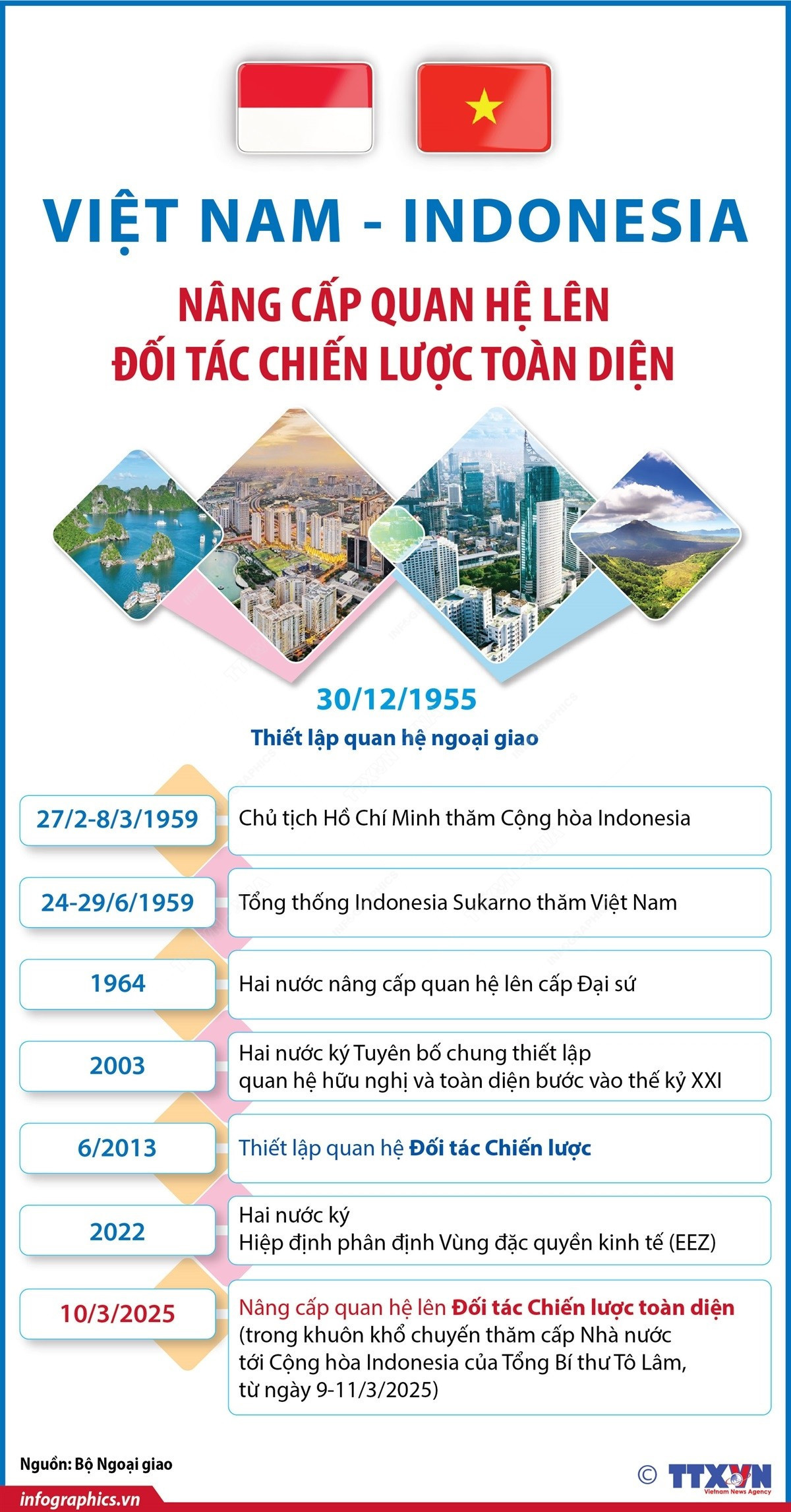 Ngày 10/3/2025, trong khuôn khổ chuyến thăm cấp Nhà nước tới Cộng hòa Indonesia (từ ngày 9 - 11/3/2025) của Tổng Bí thư Tô Lâm, hai nước đã ra "Tuyên bố chung về việc tăng cường quan hệ song phương giữa Indonesia và Việt Nam".