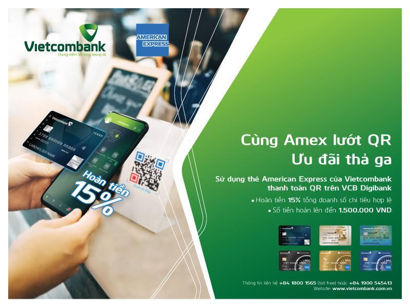 Với mạng lưới chấp nhận thanh toán QR VNPAY cực lớn với số lượng lên đến 60.000 đơn vị phủ sóng rộng rãi trên toàn quốc, chủ thẻ Vietcombank AMEX quét mã thanh toán QR một cách dễ dàng, thuận tiện. Đáng chú ý, Vietcombank ra mắt thêm chương trình ưu đãi “Cùng Amex lướt QR - Ưu đãi thả ga” hoàn tiền lên đến 1.500.000 đồng từ đó đáp ứng tối đa nhu cầu mua sắm, chi tiêu trực tuyến của chủ thẻ.