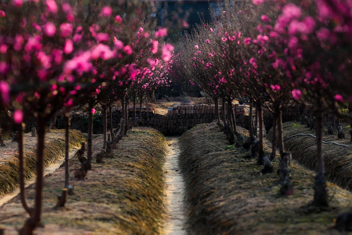 | Vườn đào nở "đỏ rực" khu vực Nhật Tân (Tây Hồ, Hà Nội). Ảnh: TUNG CAO |