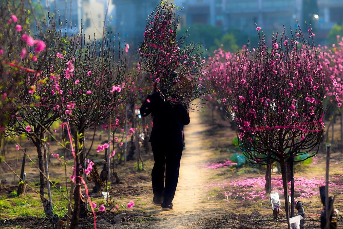 | Vườn đào Nhật Tân những ngày cuối năm càng thêm nhộn nhịp. Ảnh: TUNG CAO |