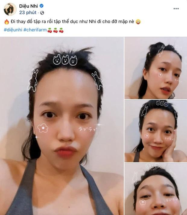 Diệu Nhi cũng đã cập nhật hình ảnh mới sau tin đồn sinh con. Cô cũng chỉ đăng tải ảnh chụp nửa người và rủ mọi người cùng tập thể thao giảm cân. Ngay lập tức, netizen săm soi vóc dáng Diệu Nhi và nhận ra nữ diễn viên đã tăng cân đáng kể với khuôn mặt tròn trịa thấy rõ. Thậm chí có người còn chú ý thấy vòng 1 của Diệu Nhi có những đường gân xanh, rất giống những phụ nữ mới sinh và đang cho con bú.