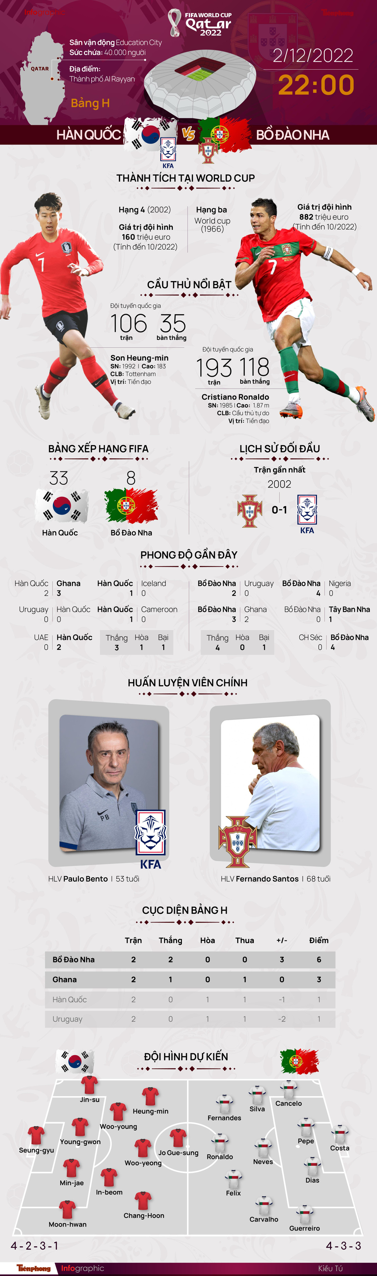 TPO - Hàn Quốc sẽ có trận đối đầu với Bồ Đào Nha trong loạt trận cuối bảng H World Cup 2022. Với thành tích toàn thắng ở cả 2 lượt trận, Bồ Đào Nha đã sớm giành vé vào vòng 1/8 mà không cần quan tâm tới kết quả lượt trận này. Bên kia chiến tuyến, nếu thắng Bồ Đào Nha 2 bàn và trận đấu cùng giờ Ghana - Uruguay có tỷ số hòa, Hàn Quốc sẽ giành quyền đi tiếp.