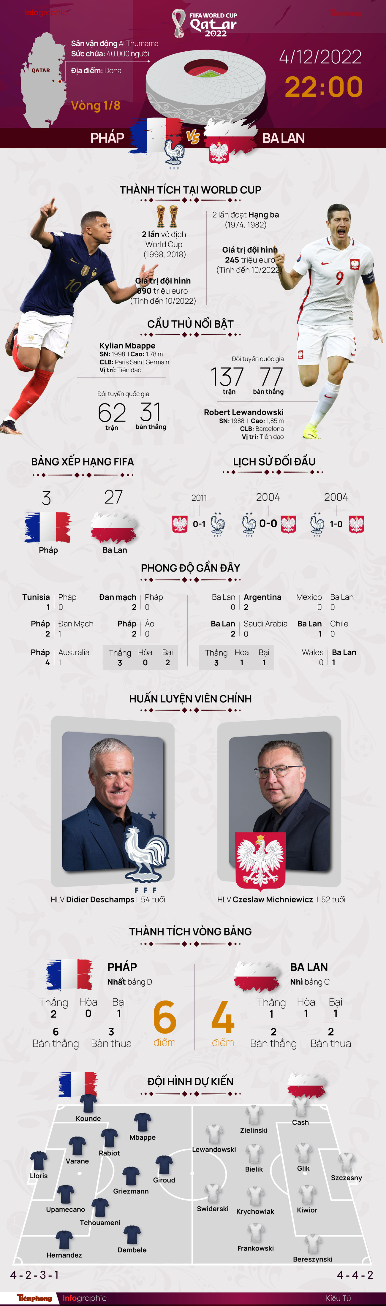 TPO - Pháp và Ba La sẽ có trận đấu loại trực tiếp tại World Cup 2022. Dù cùng để thua trong lượt trận cuối vòng bảng, nhưng cả 2 đều lọt vào vòng 1/8 với hai kịch bản khác nhau. Pháp đã sớm có tấm vé đi tiếp sau khi thắng 2 trận đầu, còn Ba Lan thì phải rất vất vả mới đứng được vị trí thứ 2 bảng C.