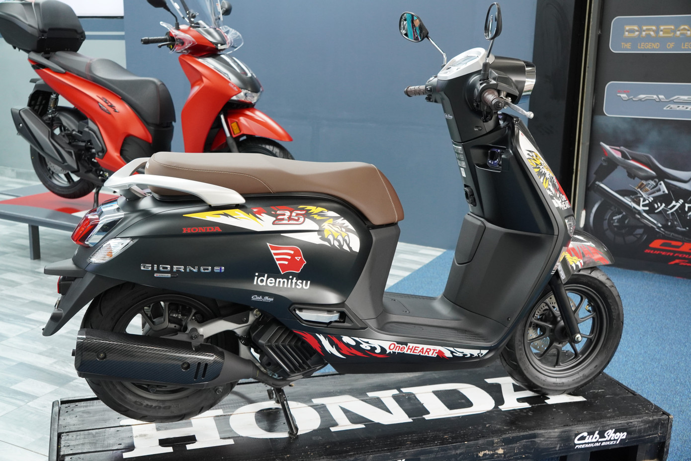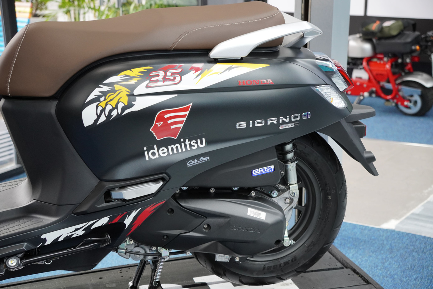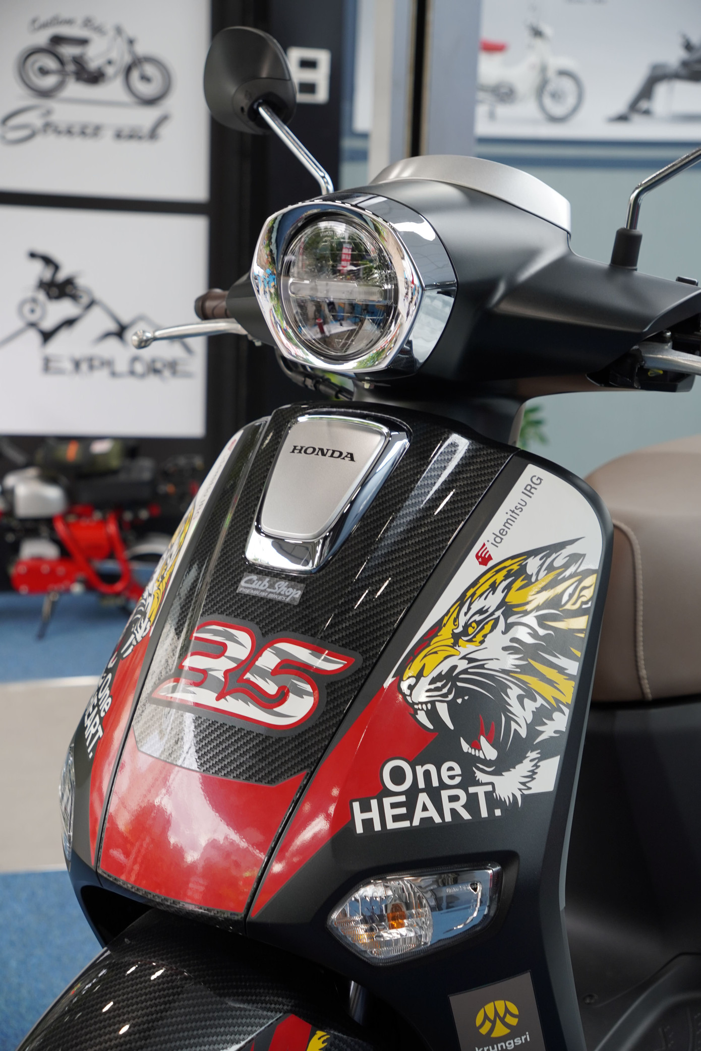 Điểm nhấn đặc biệt nhất trên chiếc Honda Giorno+ Moto2 ThaiGP chính là lớp ngoại thất đen nhám cùng bộ tem độc quyền lấy cảm hứng từ chiếc xe đua "Roaring Tiger" của tay đua nổi tiếng Somkiat Chantra người Thái Lan.