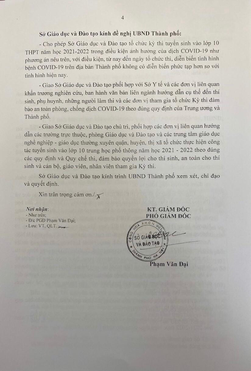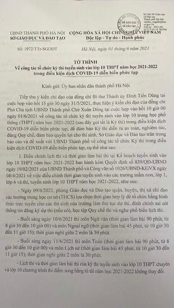 Thế nhưng mới đây, teen và phụ huynh lại truyền tay nhau một văn bản được cho là ban hành vào hôm qua 1/6 của Sở GD&ĐT Hà Nội trình UBND thành phố Hà Nội về công tác tổ chức kỳ thi tuyển sinh vào lớp 10 THPT 2021 - 2022 trong điều kiện dịch COVID-19 diễn biến phức tạp.